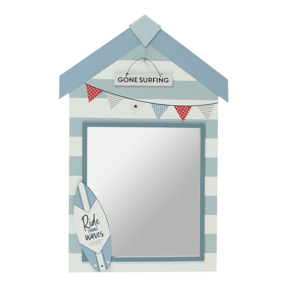 This whimsical wall mirror is shaped like a beach hut and is finished off with a cute surf board and 'gone surfing' accent. Perfect for any seaside abode. Product Dimensions: H48cm x W30cm x D9cm Packaged Dimensions: H49cm x W31cm x D10cm