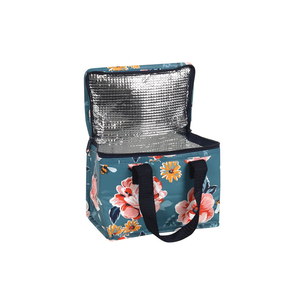 This insulated lunch bag will keep food safe and fresh all day long. Features a lovely floral design with navy handles and zipper. Made of 40% recycled plastic.