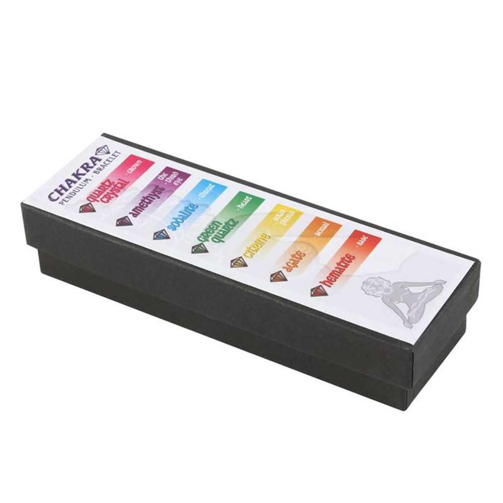 Beautiful clear quartz bracelet which can be unlinked to use as a pendulum for spiritual practices such as dowsing or crystal healing. Also features seven smaller beads designed to represent the colours of the seven chakras. Product Dimensions: H2.6cm x W12.6cm x D4cm Packaged Dimensions: H2.5cm x W4cm x D12.5cm