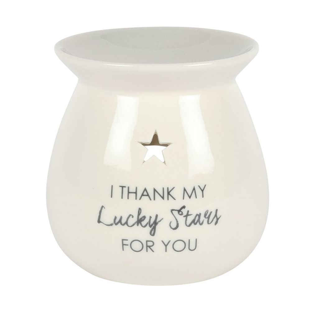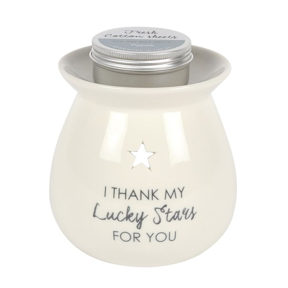 This wax melt burner gift set includes agrey-accented ceramic burner with cutout star and 'I thank my lucky stars for you' text. Includes a tin of Fresh Cotton Sheets eco soy wax melts in a lovely gift box and makes a lovely gift. Product Dimensions: H11cm x W11cm x D9cm Packaged Dimensions: H16cm x W12cm x D11.5cm