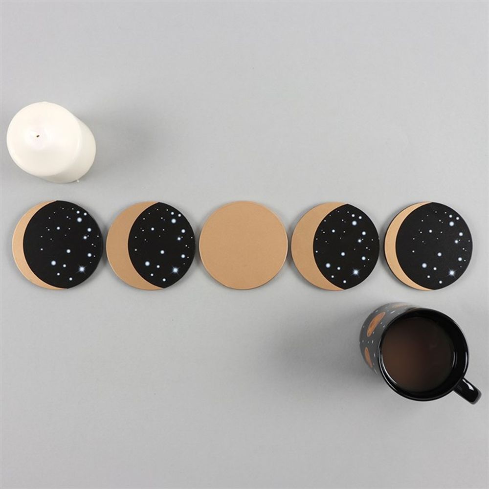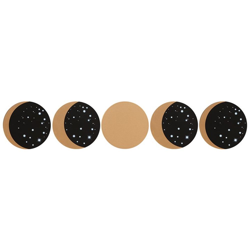 Set of 5 coasters which when aligned represent the moon phases. Made in contrasting colours of natural wood painted with black to represent the night sky, dotted with stars. Product Dimensions: H9cm x W9cm x D0.5cm Packaged Dimensions: H5cm x W10cm x D10cm