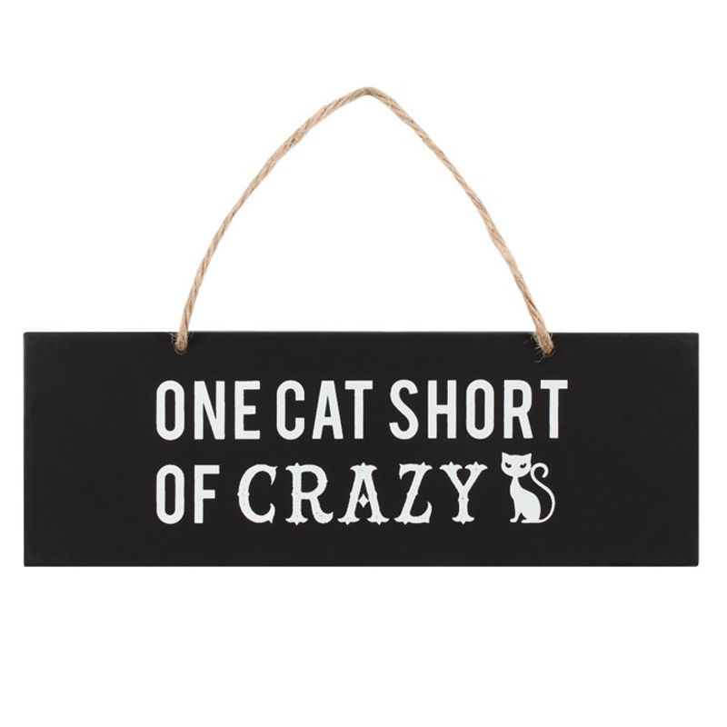 Black hanging wall sign featuring the text 'One Cat Short of Crazy'. Product Dimensions: H7cm x W20cm x D1cm Packaged Dimensions: H9cm x W22cm x D1cm