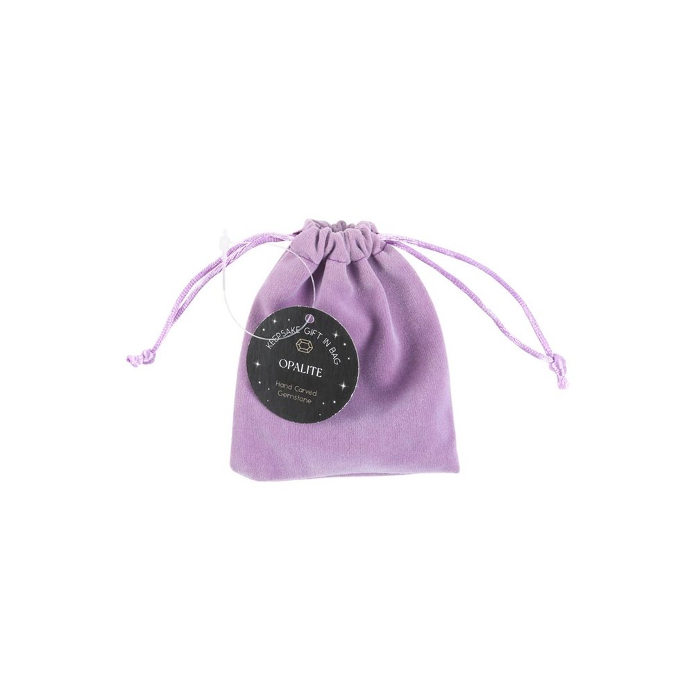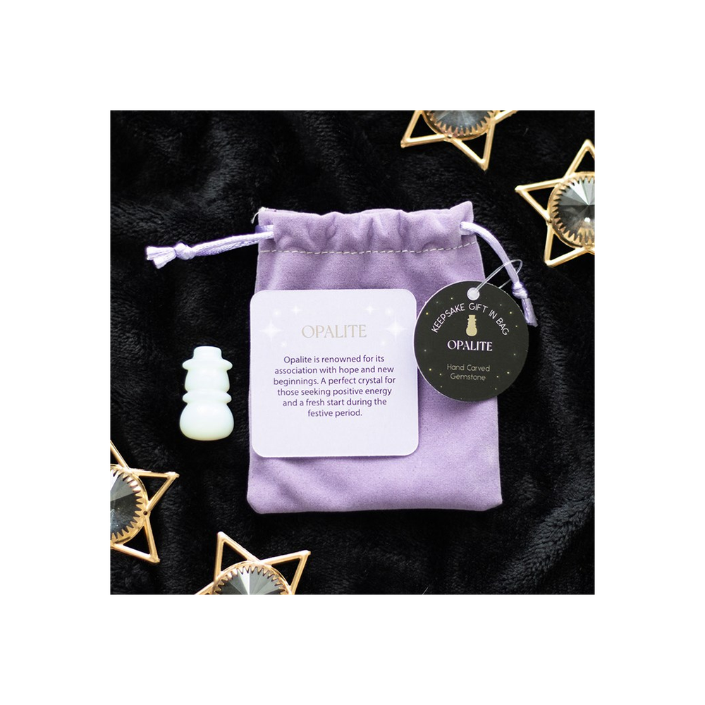 Add a touch of festive magic with this opalite crystal snowman in a bag. Hand-carved into an adorable snowman, this gemstone is crafted from opalite for promoting hope and new beginnings, and for amplifying festive spirits throughout the season. Perfect for decorating or gifting, this unique crystal is kept safely in a matching velvet drawstring bag. As each crystal is unique, stone shape and colour may vary from photos shown.