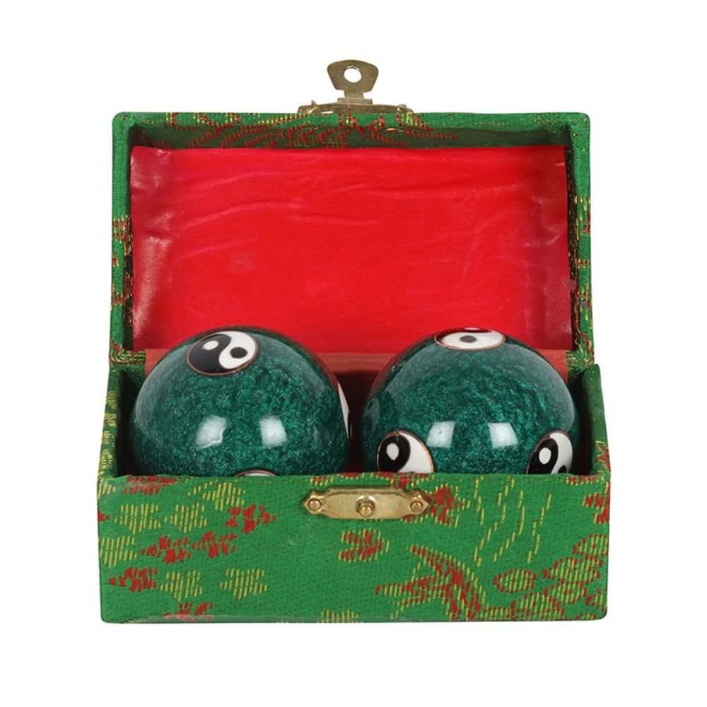Metal stress balls, also called baoding balls or Chinese health balls, are used to improve dexterity, aid in meditation and improve brain function when carefully rotated in the palm of the hand. When knocked together, a gentle ring is heard. Set includes two balls in a matching, covered box. Product Dimensions: H5.5cm x W10.5cm x D6cm Packaged Dimensions: H5.5cm x W10.5cm x D6cm