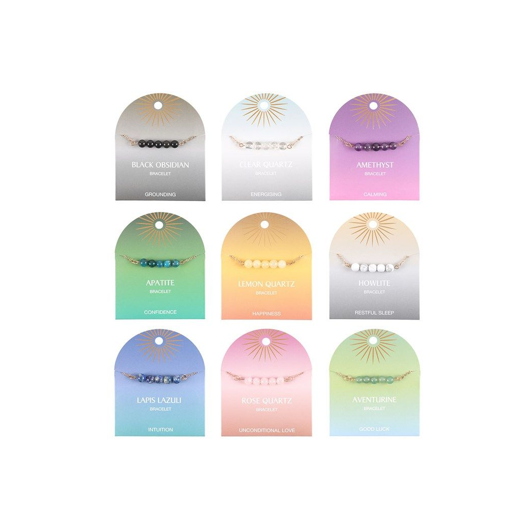 Carry the power of crystal healing on-the-go with this set of 9 crystal beaded chain bracelets. Each bracelet features 5 gemstone beads that are strung on a delicate yet durable gold-tone chain. Ideal for stacking or wearing individually for a touch of elegance to any outfit. Add a zodiac charm to the bracelet for a personalised touch (sold separately). This set includes 1 of each of the following crystal bracelets: Black Obsidian, Clear Quartz, Amethyst, Apatite, Lemon Quartz, Howlite, Lapis Lazuli, Rose Quartz and Aventurine. Jewellery is nickel-free stainless steel.