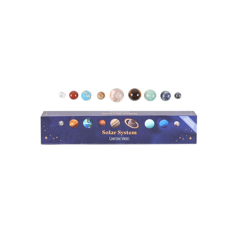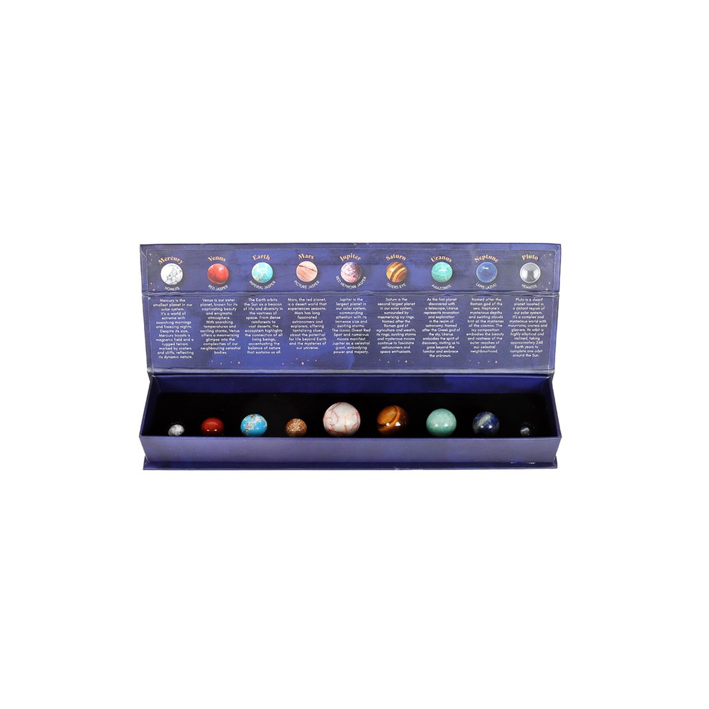 This gemstone sphere set features 9 gemstones that represent a planet from the solar system. Each gemstone is carefully selected and polished to resemble the size, colours and textures of the planets. Crystals in this set include howlite, red jasper, imperial jasper, picture jasper, red network jasper, tiger's eye, amazonite, lapis lazuli and hematite. Beautifully presented in a gift box with information about each planet's meaning inside. As each crystal is unique, stone shape and colour may vary from photos shown.