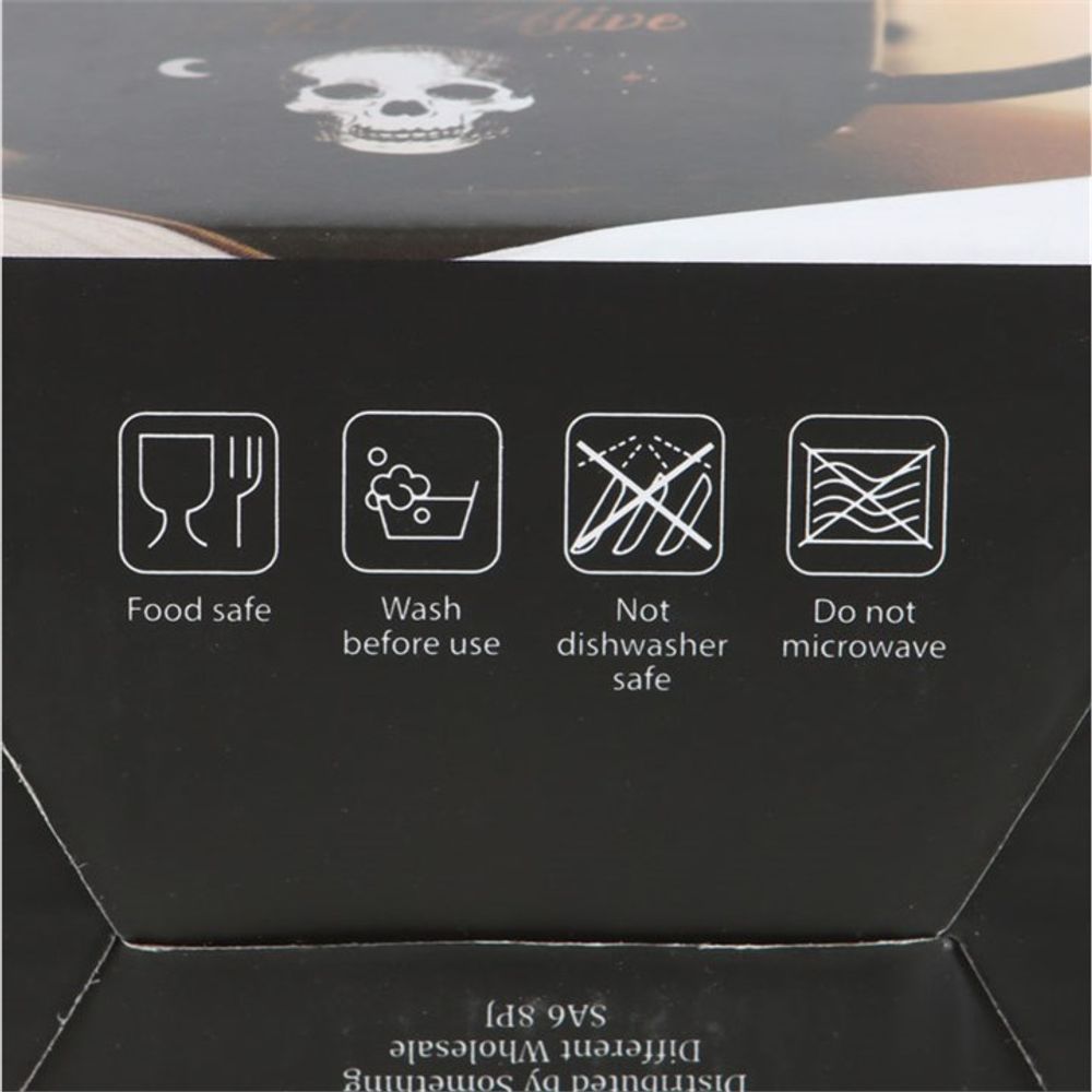 Get through the day with this relatable mug featuring the phrase 'Just Trying to Feel Alive'. This mug is a must-have for anyone who knows the struggle of starting their day before their first cup of coffee. Its playful black and gold skeleton design speaks to the soul of coffee enthusiasts and night owls alike. Handwash only. Not suitable for microwave use. 360ml.